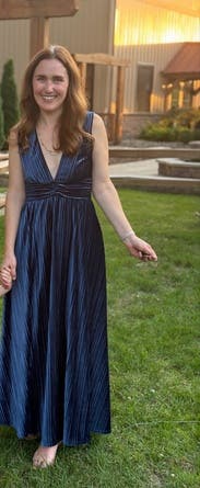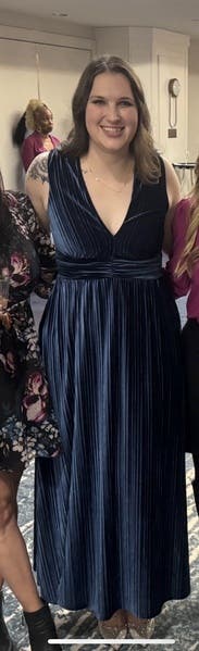 This dress was perfect for a wedding I attended. It fit well, was comfortable, and I received so many compliments. It’s velvet so it was a bit warm in the sun during the ceremony, but great as it cooled down as the evening continued.