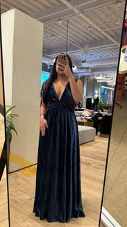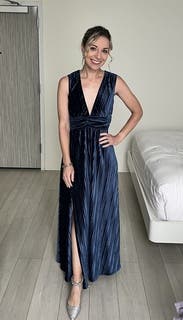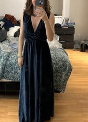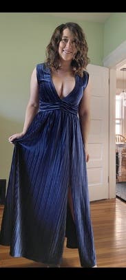 I think velvet/this material is so cheesy and not classy but this dress is PRISTINE. it's not pleated but has these lines in the material that really elevate it. The slit is perfect, not too high. I loved the plunge neckline and it had rubber lining so you didn't have any nip slips. I got so many freakin compliments on this dress. It was also crazy comfortable. Cannot recommend enough.