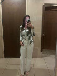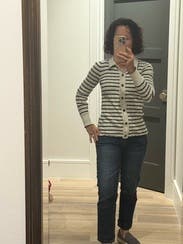 My normal size was out of stock so I sized up and given the stretchy fabric that worked just fine. The detailing on the sleeves and collar were made this top feel special. Definitely more of a cream base than white, and closer to black stripes than navy. Really enjoyed this piece