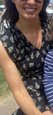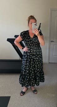 This is a GREAT dress. It can be dressed up for work or can be worn casual. It has some nice stretch to it and was able to wear in my second trimester. Would also love wearing this dress if I wasn’t pregnant!