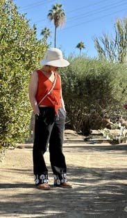 These pants are made of medium weight cotton, so they don’t wrinkle too terribly. They have white embroidered palm trees on the bottom of each leg. I wore them to a concert in which I got tons of compliments. I wore them again just to hang out and go shopping. They are not my usual style, but maybe I will change that.