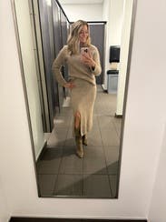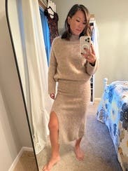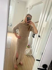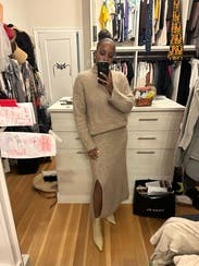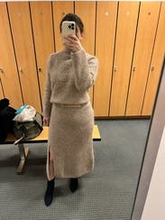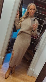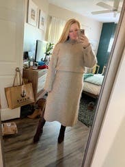 This looked amazing and IMO expensive. I felt super classy. I live in FL and it ended up being WAY too warm - I thought I might pass out. If you experience true winter, this is perfect for you! True to size. A tad itchy, so I’d wear a shirt underneath. Not sure I’d wear this without the skirt because it doesn’t do much for your figure.