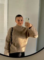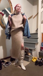 This was so soft and comfortable! I don’t want to take it off. I rented the set and it was a little difficult to style for my small frame. This sweater was definitely oversized and I wore it a few times with leather leggings and jeans. The fit isn’t exactly flattering - it is overall thick, wide, and long, but it is a stunning knit (looked and felt like cashmere? Can’t remember if it was) and many people wanted to touch it. It radiated coziness.