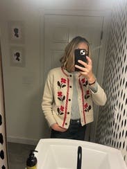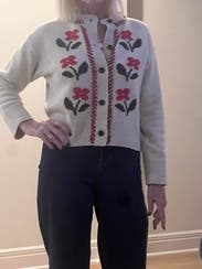 This charming Rails Mavie Cardigan is a heritage-inspired boxy-cropped knit featuring cozy jacquard florals and distinctive blanket stitching. This unique piece looks great layered over a fitted black top and paired with tailored high-waisted trousers.