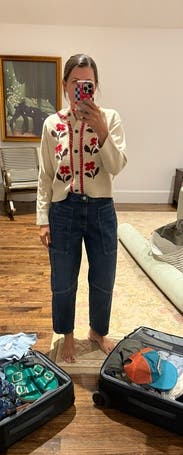 Love this fun, warm sweater. Fits loosely which is the right look for it, wouldn’t size down. Goes with everything!
