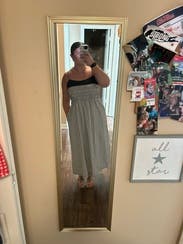 I wore this dress several times and wanted to purchase it if I wasn't pregnant as I sized up. Dress came new with tags and was perfect for every occasion from lunch and shopping to dinner out. I wore at 31 weeks pregnant.