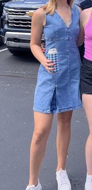 Wore this dress multiple times, it fit so well and was super flattering because of the peplum type bottom and corset waist it makes you look snatched. The denim is easy to make it casual or a bit more dressy for a daytime event. I’m 5’11” so used to things being short, but it wasn’t too short to not wear. I’m sure it’s more appropriate length for those not as tall. Perfect for summer no fuss cute outfit