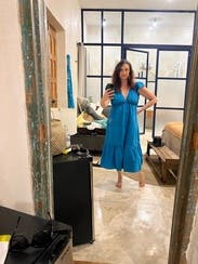 Love, loved this dress! Amazing color. Fit just right. Nice cotton type fabric. Great for my trip to Mexico in the heat. Chest area is rather sexy with a deep plunge and bit of a cut out.