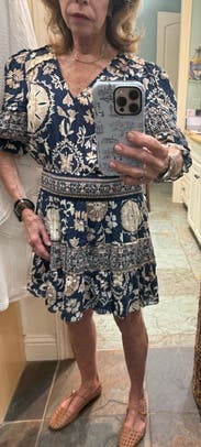 Arrived new with tags. Cute and easy to wear with a smocked waist and sleeves, but certainly not a showstopper. Pretty short (and I’m 5’3) and while it’s made of cotton, the materials is a bit scratchy. Surprised it retails for as much as it does. Also lower cut than it appears on the models.