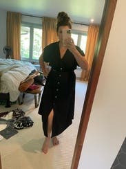 Loved everything about this dress. Comfortable and easy to style. The V-neck is pretty low cut. I found myself pulling it up a lot throughout the day. The dress is pretty loose and flowy, so you'll probably be fine sizing down.