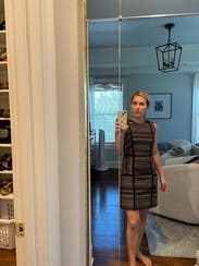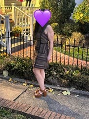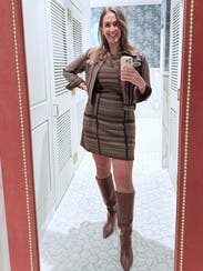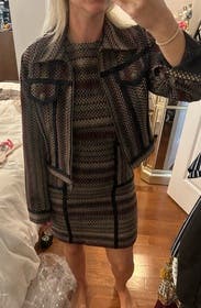 Wonderful fall dress with coordinating blazer. I wore it to work and received compliments all day. I’m 5’ 6” so it was shorter on the leg but wearing the jacket and covering my arms balanced out the length. Debated buying this outfit. Really good quality!
