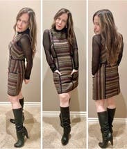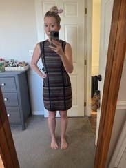 This color palette is everything I expect for Fall/Winter - rich, warm tones of burgundy, brown, beige, olive green and black with metallic gold threads woven in for a little sparkle. The strategic placement of vertical and horizontal stripes along with the black trim gives it a flattering shape for a shift dress. It’s sleeveless so I added a lightweight mesh shirt because it’s “cold” here in Southern CA right now at a frigid 55° 😂 I also grabbed the matching jacket but decided not to wear them together because I think it will be more fun to create a whole other outfit around the jacket. The dress is TTS and a good length for petites. It’s fully lined, which is good because the fabric is a little scratchy. Also has a decent amount of give so comfortable to wear all day at work.