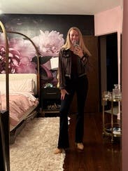 I paired this with the Hudson vegan leather reddish/burgundy color pants and it was a perfect set. Fit was perfect.