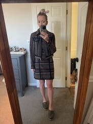 Wore this to client meetings in LA and it was so chic. Material isn't the warmest so ideal for our winters in California. A bit of sparkle in the thread which also made it quite festive. Fit great