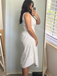 Snatched my postpartum waist and was comfortable and flattering! Also not see-through which is hard to find with a white dress.