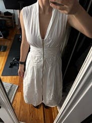 Loved this dress as an easy throw on outfit for a long weekend. The cotton material is breathable, though it does wrinkle, and since it's double lined, it's relatively opaque for the material. I really liked the zipper and pleating details. I opted for pasties instead of a bra. You can style it a million ways!