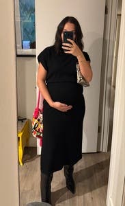 I’m 6 months pregnant and sized up to a L to accommodate the bump. Length (including side slit) was great- perfect with boots underneath. Material was soft and warm but not too thick which made it ideal for layering. Hung on to this one for a few weeks- dressed up for a few date nights and dressed simply for work meetings.