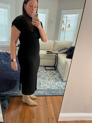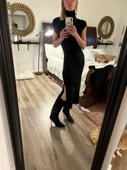 Know that the leg slit is a little high for work, especially if you are tall, have long legs or wear heels. I wore this twice, once as above and once on a date with black tall boots with a gold heels on them and a matching belt. I liked how you can style it different ways.