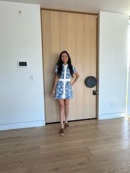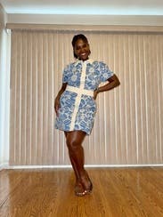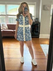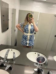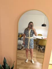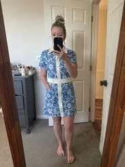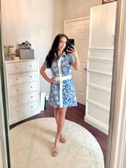 You do need to size up on this dress. I loved this dress! The fabric feels high-quality and structured but still breathable, making it perfect for a warm day. The blue and ivory floral pattern is vibrant and eye-catching without being overwhelming. The waist belt adds just the right amount of shape and makes the dress feel tailored. It hit mid-thigh on me, which felt both flirty and appropriate for daytime and even work. I got several compliments and felt very put-together. Would definitely rent again.