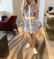This dress is new to the site, so I rented it without any reviews to go off of — let me be your test run! I needed a sizing review that’s for sure. Definitely size up 2 sizes. I ordered my usual size but wasn’t familiar with Ramy Brook sizing, and as soon as I took it out of the bag (new with tags), I could tell there was no way it was going to button. I’ve got a small chest (34B/36A), and even I couldn’t come close to closing it from the midsection up. No miracle was going to make those buttons meet! It does fit my 12 year old daughter though (was curious because the sizing seems so off!). That said, I’m giving it 4 stars because the quality is gorgeous and I know I’ll love it in the right size. Just a heads-up: it’s short. I’m 5’6” and it hit right at my lower butt crease — definitely not the vibe if you’re looking for something conservative/office appropriate. The length increases as you size up. If you’re petite and already know your size in this brand — or if you size up — this dress will be killer chic.