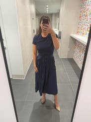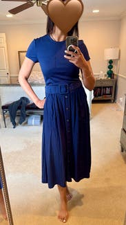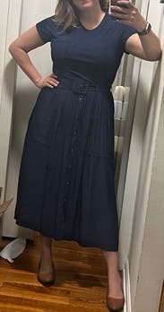 Very comfortable and professional dress, easy to layer under a white blazer but also to wear on its own since it has sleeves. I am short waisted and the belt hit me at an awkward spot, but otherwise it was perfect.