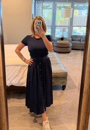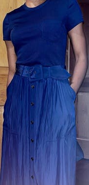 Love the update to basic navy blue. Fun pleated skirt with belt and button details that add interest. A little long for me (I’m 5’2”) but still worked fine. Super soft T shirt top. Flattering. Lightweight and flowy. Add a blazer to dress up the look. Perfect for work.