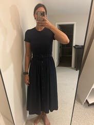 The color, the fit, the fabric, the belt - it was all fantastic! I liked how the top was made of a stretchy knit fabric with some structure and the skirt was silky and flowy. Belt hit in just the right place for a cute cinched waist. It’s great for travel as it doesn’t wrinkle easily but the belt set off the metal detectors at the airport. It’s not removable so a heads up if you want to avoid a pat down.
