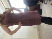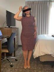 Beautiful, elegant, & professional dress. It fit great at first but a bit big around the waist for me so I put on a belt. After a couple hours it seemed to stretch out. Super comfortable and warm, great fall look. Burgundy purple color.