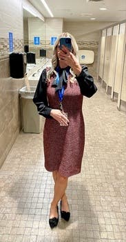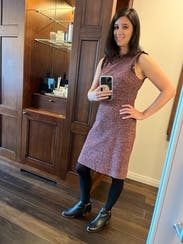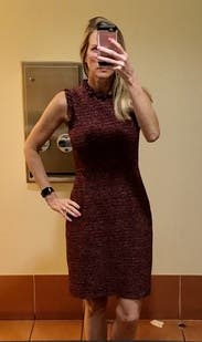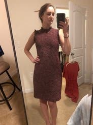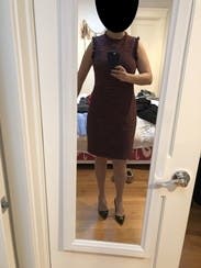 I love everything about this dress. The tweed is soft and not too thick. The lining is perfectly placed. The romantic wine color and silhouette. True to size and not too tight. The detail around the neck and arms is interesting yet professional. It LOOKS expensive (it is expensive...). Wish I could buy it!