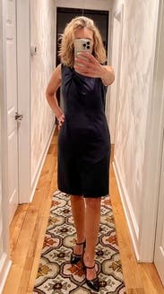 This dress looks great and feels great. I wore it in November with a velvet jacket. Love the asymmetrical neckline and front slit. It is fully lined so it’s smoothing. However, there is an annoying part the skirt, where you can see where the fabric in the front slit overlaps. Not a deal breaker, would wear again and again if I owned it.