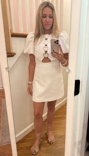 Wore on honeymoon to dinner- loved the hearts and puffed sleeve detail— great fabric and fit like a glove? Size 10 for great for a normal size 6. 🤍