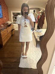 I loved this dress so much I wore it for both my rehearsal dinner and wedding welcome party! It was the perfect bridal mini—flattering, romantic, and just the right mix of sweet and sexy. The fit skimmed my body without clinging, which is exactly what I wanted. If you prefer a tighter fit and have similar measurements, I’d recommend sizing down one. The puff sleeves and heart detail made it feel extra special—such a confidence-boosting dress!
