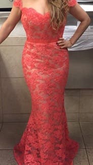 I ordered this dress through the unlimited program and was very excited to wear such a beautiful designer dress. It is very heavy, the material feels like it came off of a ballet tutu, and the color is much more orange than coral. It also fit in the hips, but was way too small in the rib cage, which is pretty odd for me. Usually, it is the other way around.