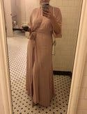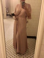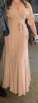 Received compliments all night. The MR drug the floor even with 4" heels, and the top liked to pop open, but made it work since the SM was not available. The true, wrap-style gives you some ability to adjust. The soft color is flattering, and the slim-ish fit through the hips is flattering. Even though it is a crepe-y material, the dress is susceptible to wrinkling, so take care. Had to iron the belt before wearing, the car's seat beat wrinkled the top on the way to my event, and by night's end, the skirt was a bit rumpled. But overall, a lovely dress.