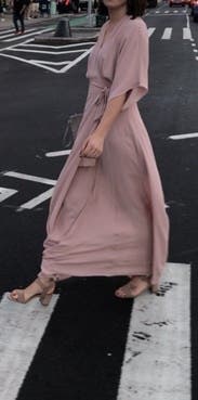 Gorgeous dress. Classic kimono sleeve. Fabric is heavyweight but looks light and flows nicely. The dress is long so if you're average height (I'm 5'4) you will need to wear heels or at least be mindful when you walk and hold the front up.