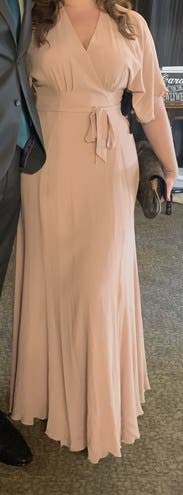 I'm only 5'2" so this dress was exceptionally long on me. I wore it for family photos on the beach and it was perfect because it didn't matter if it was too long. The wrap stayed closed and the skirt was so flowy, it was perfect! It's a nice blush color. My only complaint was this fabric was impossible to keep wrinkle free in the garment bag it was delivered in. It was so outrageously wrinkled I almost didn't wear it. Do not recommend if you don't have your own steamer. I had to steam this in order for it to be wearable.