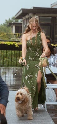 I rented multiple green dresses for the wedding week, where the only rule for our “team bride” was to wear green for different events throughout the week. This dress ended up saving the day. I originally wore it for our rehearsal dinner, but my sister had a mishap with her outfit right before walking down the aisle as the flower girl, and this dress saved the day! Not only did it look amazing, but it had flowers on it which was basically pretty close to more than perfect! The fit is super flattering, the slit gives it great movement, and the print is even prettier in person. It’s very comfortable and perfect for summer events. Definitely fit true to size.