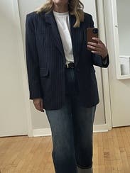 I have worn this one so much! Took it to Paris and wore to Dior museum, wore it with jeans several times and the cut just levels up jeans and a T-shirt, worn here with navy pinstripe pants from RTR. Rent it and you might just buy it.