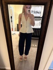 Great staple by Reformation. Not too revealing, tucked in at the waist. Looks cute w pants or skirts.
