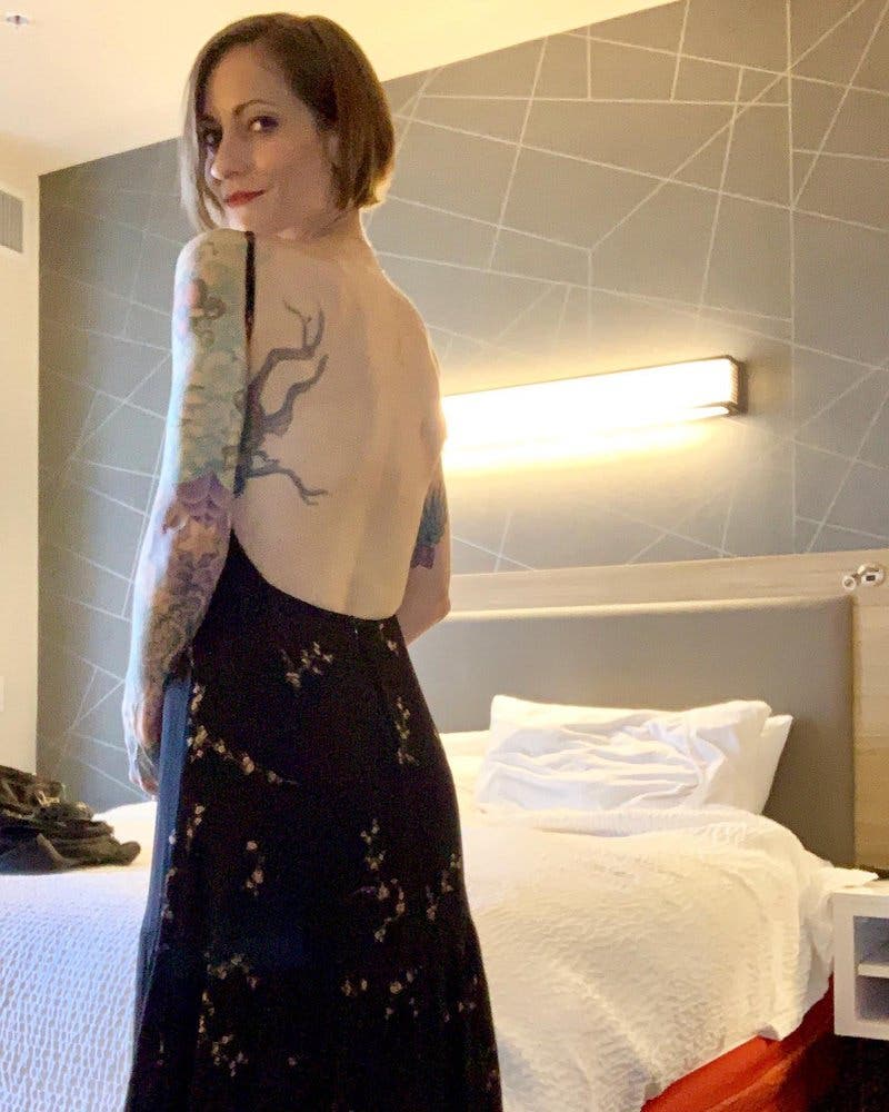 Black and pink floral crepe (100% Viscose). Gown. Sweetheart neckline. Sleeveless. Adjustable straps. Exposed back zipper. 55" from shoulder to hemline. Made in USA.