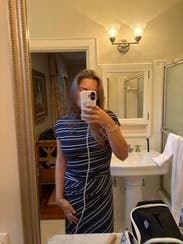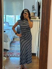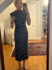 I liked the cut and stripes, and it’s a nice light jersey fabrics. It felt flattering on, but I found myself adjusting it a bunch throughout the day. It wasn’t my favorite on me, but glad it gave it a try!