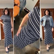 Effortless Nautical Elegance In timeless navy and white, this full-length dress captures the essence of seaside sophistication. The artful angled stripes create a graceful, elongating silhouette that flatters every figure, while the soft, stretchy fabric offers both comfort and flexibility—ideal for expectant or petite frames alike. A gently flared sleeve adds a touch of movement, and with no zippers required, the design slips on with ease. Whether styled for a yacht club luncheon, a breezy afternoon affair, or a polished business setting, this versatile piece defines understated luxury and effortless charm. Navy and Grey with white pinstripe. Great for travel (lightweight, doesn’t wrinkle easily and multi functional)