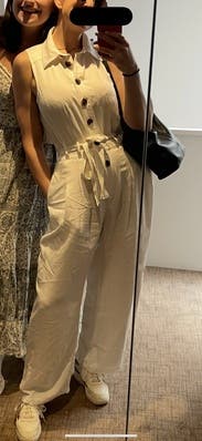 White (Main 85% Viscose, 15% Linen. Lining 100% Viscose). Jumpsuit. Sleeveless. Collared. Front button closure. See size & fit notes for length and measurements. 30" inseam. 13" rise. 8" leg opening. Imported.