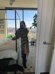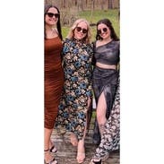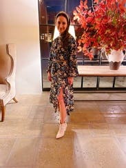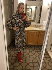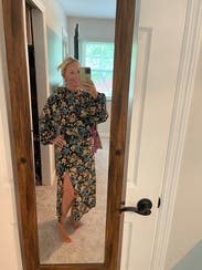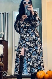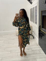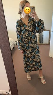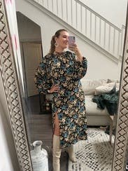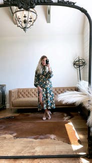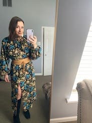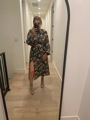 I wore this dress for my bday dinner and loved it! The pattern is so different. I paired a belt with it because it definitely felt like a mumu. The high slit definitely helps with this one.