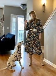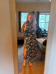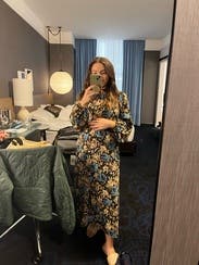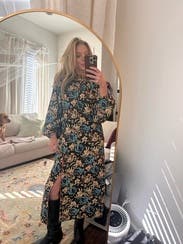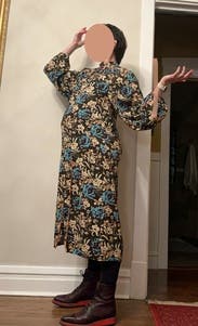 Was not expecting to love this as much as I did! Super comfortable and slightly sexy with the mid-thigh slit. It’s got the muumuu silhouette but so well made. Lots of compliments from coworkers and perfect to wear pregnant.