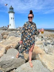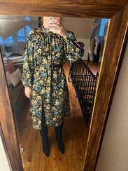 I am 3 months postpartum and was looking for something with a bit more coverage for my sister’s January baby shower. This was perfect! I added a belt and slouchy suede boots, and I loved the whole look. I actually thought it was quite flattering once I added the belt to accentuate my waist. Beautiful fabric, and loved the piping and high slit as echoed by others. May have to rent this one again!