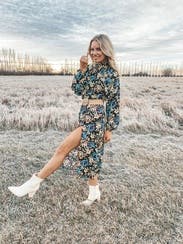 Loved the juxtaposition of the covered up high neck but high leg slit. I wore without a belt for the oversized mumu looks with white cowboy boots. Pattern perfect for fall.