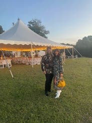 7 months pregnant and digging this vintage pattern and drape. Pink/orange trim on neck and slit is lovely. Would definitely rent again, including when I’m back to normal size! Only complaint is the facing on the slit falls down. (Pressing problem?)