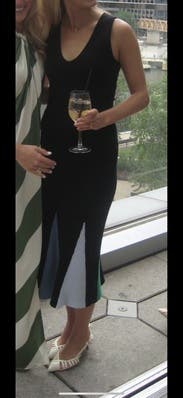 Wore at book signing and talk for "Something Lost, Something Gained" by Hillary Clinton. It was freezing in the theater so I had to wear a cropped sweater over it. Absolutely loved the dress and the darted shades of blue in the mermaid hemline were perfect for the occasion. Really loved everything about the dress and will look to buy it in the future, if possible.