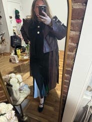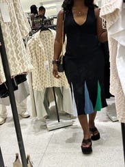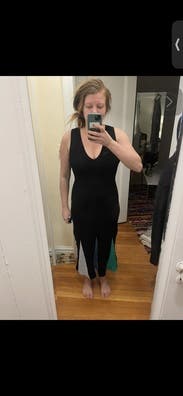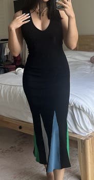 The knit on this is quite thick, so nothing underneath shows through. It's got good stretch and it holds you in well, but there's room to eat/bloat. The armpits didn't lay nicely on me, but that's most likely because i'm fuller chested. It didn't ruin the look though! I paired it with a laved turtle neck to compliment the colors at the bottom of the dress and make it appropriate for work. Wore it with boots for a Pheobe Buffay/Rachel Green vibe. 8/10